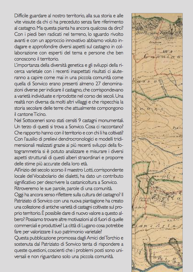 Con i piedi ben radicati nel terreno, lo sguardo rivolto avanti e con un approccio innovativo abbiamo voluto indagare e approfondire diversi aspetti sul castagno in collaborazione con esperti del tema e persone che ben conoscono il territorio. L’importanza della diversità genetica e gli sviluppi della ricerca varietale con i recenti inaspettati risultati ci aiuteranno a capire come mai in una piccola comunità come quella di Sonvico erano presenti almeno 27 denominazioni diverse per indicare il castagno, che corrispondevano a varietà individuate e riprodotte nel corso dei secoli. Una realtà non diversa da molti altri villaggi e che rispecchia la storia secolare delle terre che attualmente compongono il cantone Ticino.